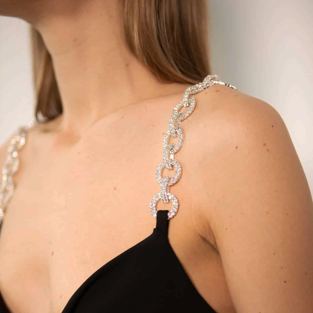 Elevate your outfit with Zariya, a dazzling pair of detachable crystal shoulder straps designed to transform any bra, tube top, or dress into a statement piece. Featuring bold interlinked rings encrusted with sparkling white stones, these golden shoulder straps bring the perfect blend of glamour and versatility to your wardrobe.